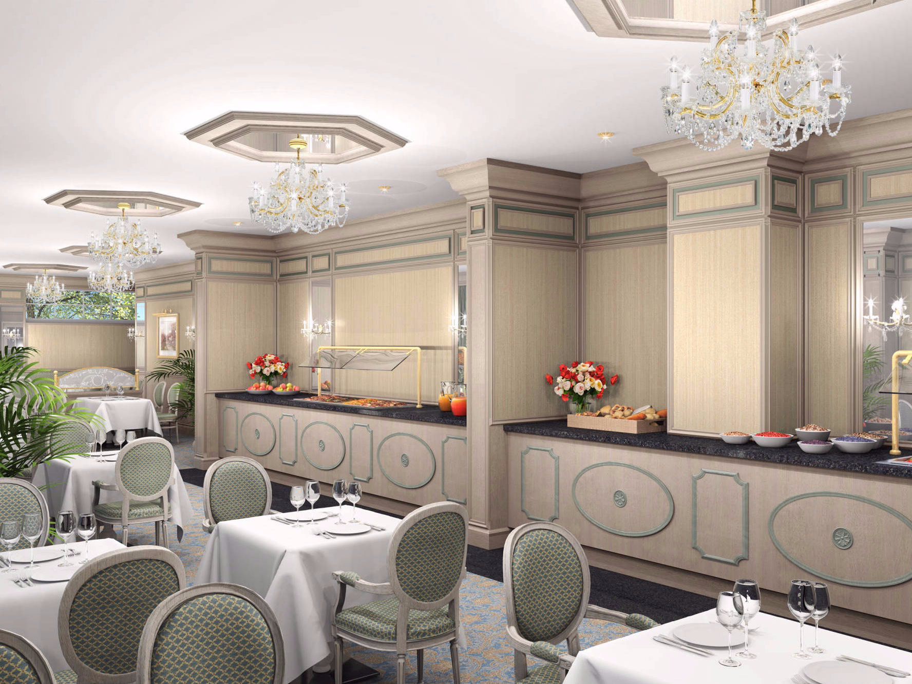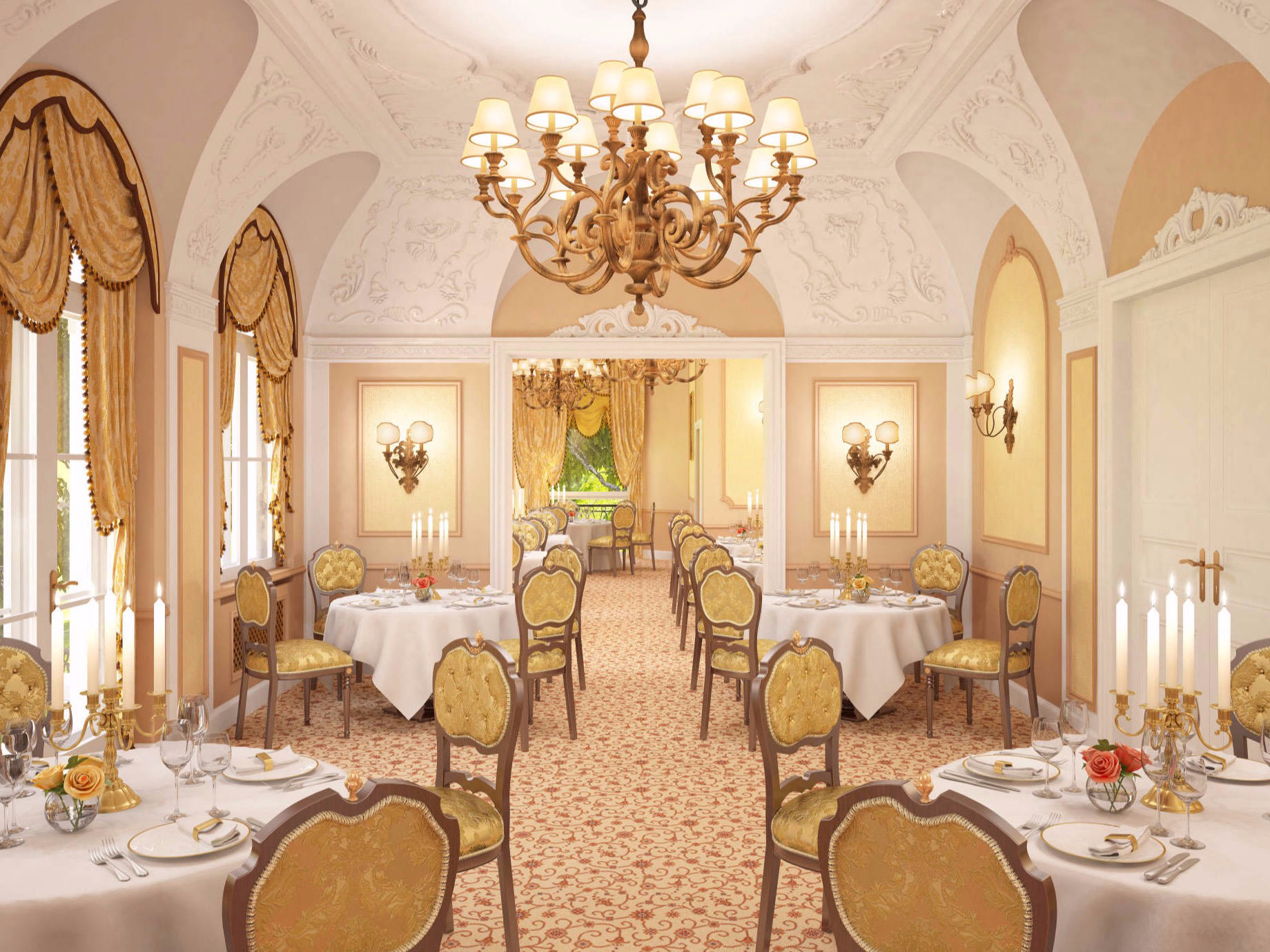 On the ground floor are the spacious lounge with the two adjoining conference rooms Salon Prague with 34 sqm and Salon Vienna with 54 sqm. In addition to an outdoor terrace, the restaurant area has three rooms, one of which can be separated for smaller celebrations.