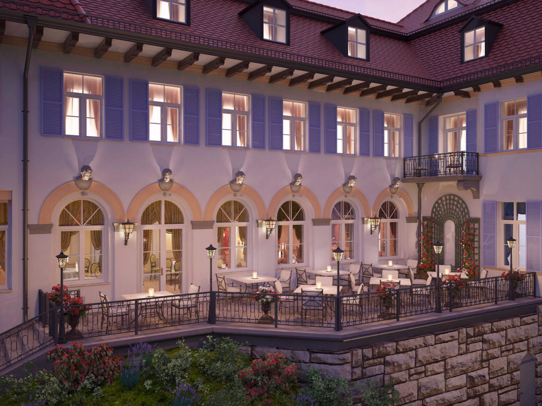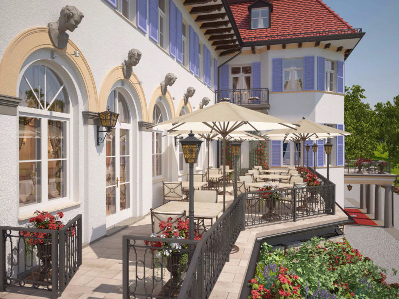 In addition to the historic castle, the complex includes a branch with 75 comfortable rooms and suites, a classic restaurant, an English Bar and a Bavarian Stüberl. These include an indoor pool and a lavishly furnished spa area, a state-of-the-art gym, and the rooftop jacuzzi.