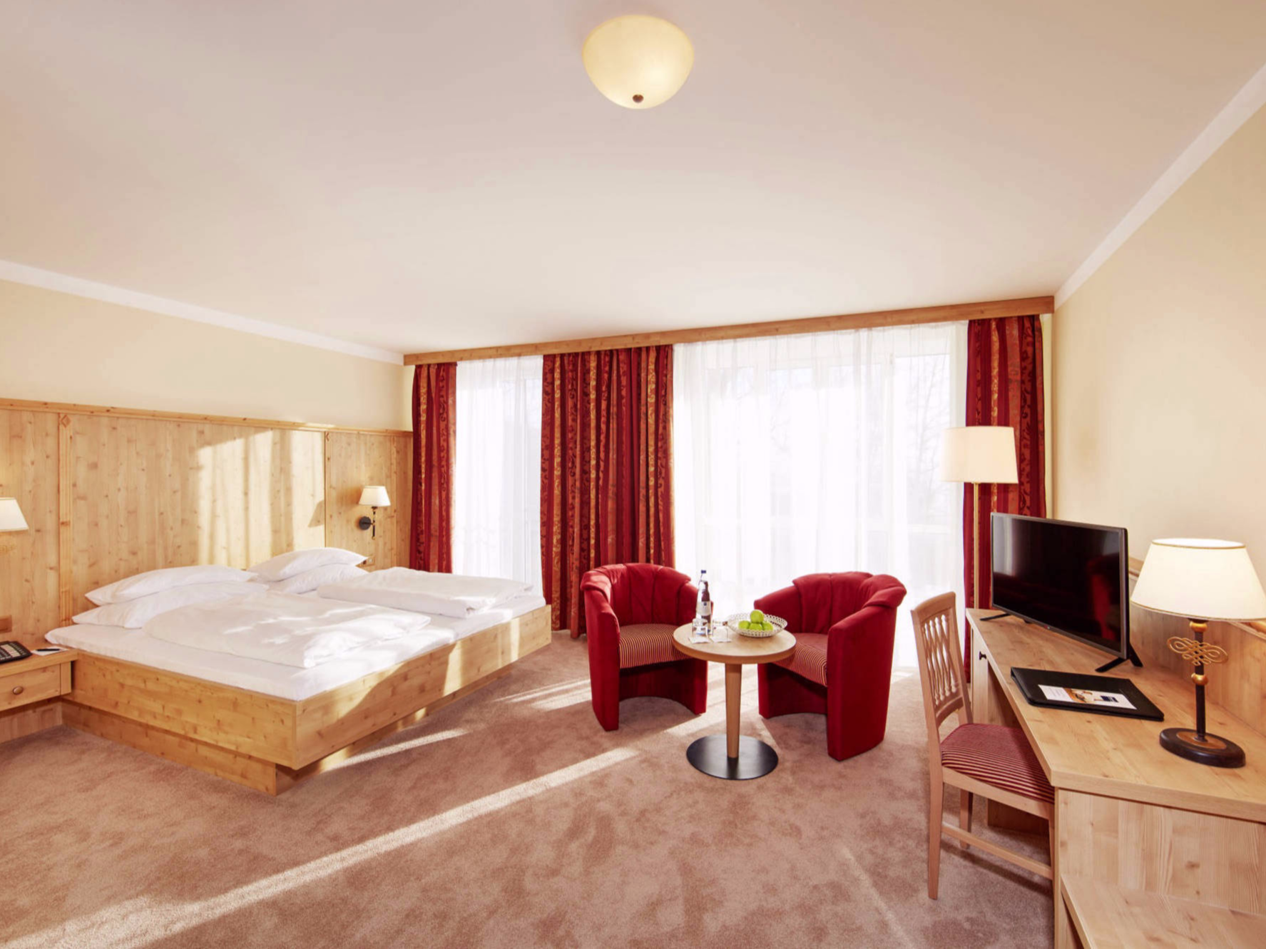 The attractive location in the Bavarian Forest Nature Park near the Grosser Arber ski area with its versatile hiking paths, attractive cycling and biking trails, its own 1-hectare outdoor sauna village with 9 log cabins, a bar, and a heliport guarantees the exclusivity of the hotel complex.